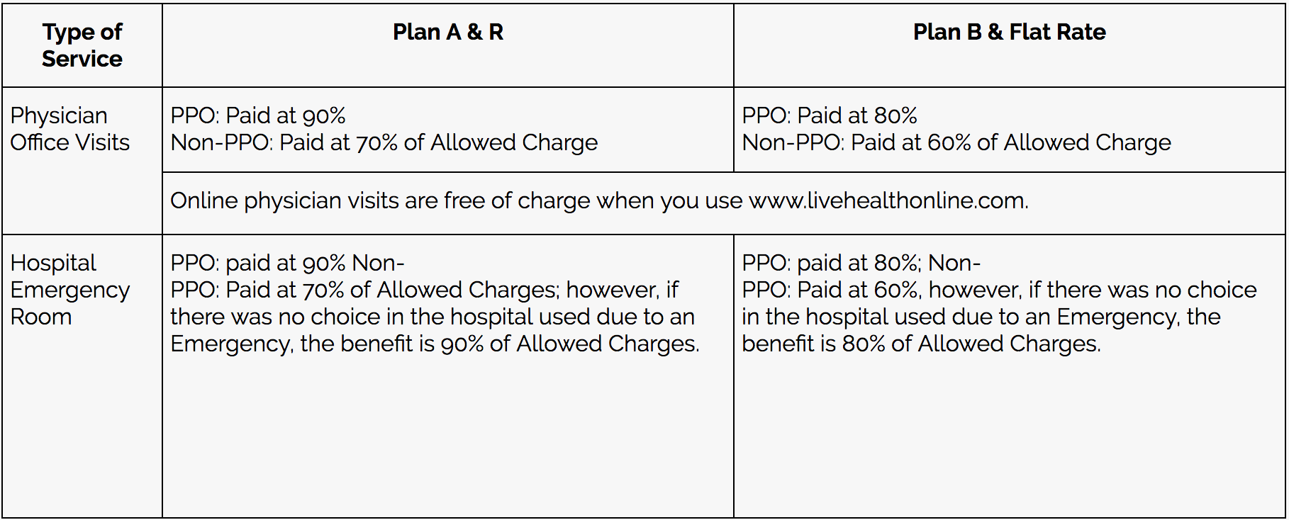 Under the Indemnity Plan, covered services are paid based on the type of service rendered, whether or not the provider was a PPO provider and which Plan you are enrolled in.  Generally speaking, after meeting the calendar year deductible of $128 per person/per year, most PPO services are paid at 90% (Plan A or Plan R) or are paid at 80% (Plan B or Flat Rate Plan).