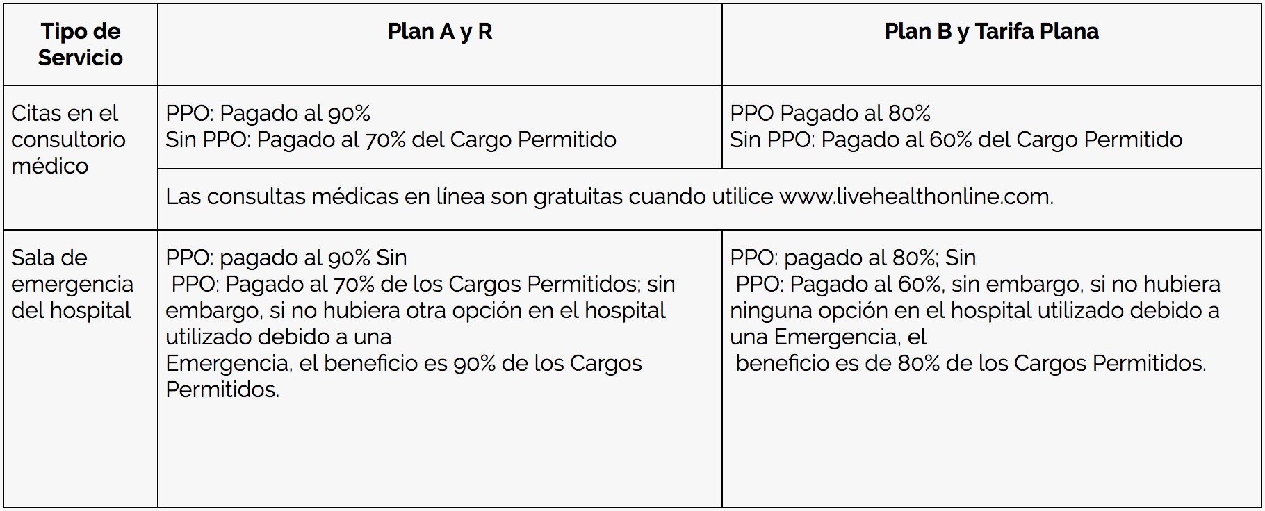 Conforme al Plan de Indemnity, los servicios cubiertos se pagan según el tipo de servicio recibido, independientemente de si el proveedor fue o no un proveedor PPO y en qué Plan está inscrito. En general, después de alcanzar el deducible por año calendario de $128 por persona/año, la mayoría de los servicios PPO están pagados al 90% (Plan A o Plan R) o al 80% (Plan B o Plan de Tarifa Plana).